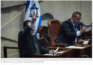 Der Parteivorsitzende der arabisch-jüdischen ‘Hadash-Ta’al’ Partei, Ayman Odeh, zeigte sich erfreut, dass der Versuch, ihn aus der Knesset zu entfernen, nicht erfolgreich war. Statt der notwendigen 90 Stimmen konnten sich nur 73 MKs für den Antrag erwärmen. 15 Mks stimmten gegen den Antrag. Die übrigen Mks blieben der Abstimmung fern. «Der verabscheuungswürdige und faschistische Vorstoss gegen mich ist gescheitert. Wir werden uns entschlossen gegen den Faschismus stellen und für Demokratie, Gleichheit und Frieden kämpfen», twittert er. «Von hier aus müssen wir beide Völker vom Joch der Besatzung befreien. Denn wir sind alle frei geboren!» Im Vorfeld der Abstimmung war es zu tumultartigen Szenen in der Knesset gekommen.Vier MKs, die Odeh bei seiner Stellungnahme immer wieder lautstark unterbrachen und verbal angriffen, wurden aus dem Plenarsaal entfernt.