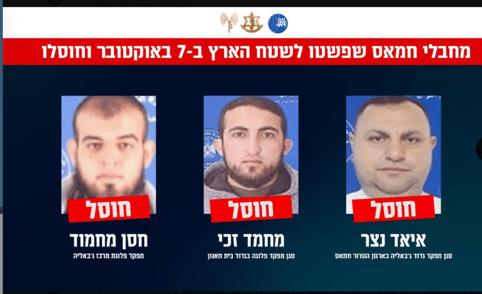 Der IDF gelang es mit verschiedenen gezielten Angriffen vier der Hamas-Terroristen zu eliminieren, die massgeblich an den Massakern von 7. Oktober 2023 beteiligt waren. Iyad Nezer, der stv. Kommandant der Jabaliya-Gruppe, war nach dem Massaker regelmässig an Terrorangriffen gegen Israelis beteiligt. Hasssan Mahmoud Muhammad Marri war Kommandant der Jabaliya-Gruppe und Muhammad Zaki Shamada Hamed war stv. Kompaniechef des Beit-Hanoun-Bataillons. Auch sie waren massgeblich am Massaker beteiligt. Am Nachmittag wurde der Tod eines weiteren, Hamas-Terroristen bekannt. Muhammad Ghaseen wurde bereits in der vergangenen Woche neutralisiert.