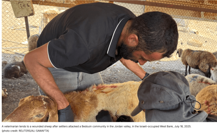 Palästinensische Medien berichten, dass während der Nachtstunden jüdische Siedler-Terroristen in einer beduinischen Siedlung 117 Tiere getötet und weitere 400 gestohlen haben. Tierärzte wurden beigezogen, um die durch Messerstiche verletzten Tiere zu behandeln. Der Vorfall fand im Dorf Al-Malih im nördlichen Jordan-Tal statt. Polizei und IDF gaben noch keine Kommentare über diesen bestialischen Vorfall ab.