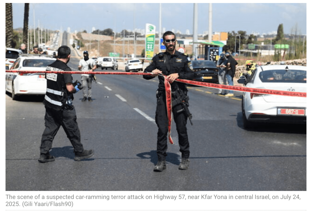 In der Nähe von Netanya kam es heute zu einem Terroranschlag. Arkan Khaled, 27, fuhr mit seinem Pkw in eine bei einer Busstation wartende Gruppe von Menschen. Acht Soldaten wurden bei diesem als Terror eingestuften Vorfall verletzt. Der Mann beging Fahrerflucht. In Samaria verliess er sein Fahrzeug und versuchte zu Fuss zu fliehen. Er konnte noch nicht festgenommen werden. Ob das Fahrzeug vom Terroristen gestohlen wurde, wurde bisher nicht bekanntgegeben. Die Sicherheitskräfte haben die Übergänge nach Samaria gesperrt. Der Unterstand bei der Haltestelle ist einesr der letzten, die noch nicht gegen Anschläge dieser Art gesichert sind.
