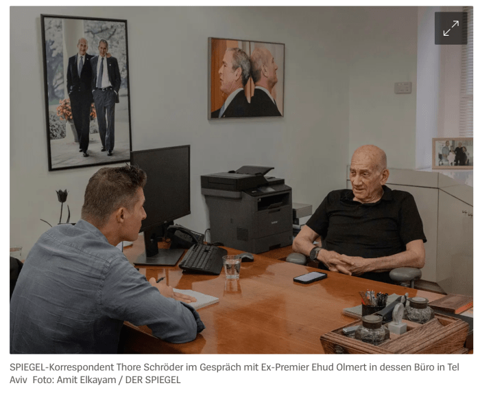 Ehud Olmert, 79, ehemaliger PM, hat im Spiegel ein bemerkenswertes Interview gegeben. Er ist ein scharfer Kritiker von Netanyahu, der sich nicht scheut, wahre Worte nicht nur im kleinen Kreis zu sagen, sondern auch schriftlich zu dokumentieren.
