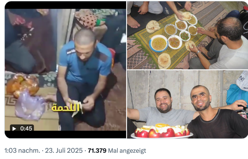 Hunger wird eingesetzt als Kriegsverbrechen. Das ist das eine, was man Israel weltweit vorwirft. Und natürlich der Genozid an den Gazanern. Seit KI/AI den Weg in alle Medien gefunden hat, möchte ich euch das die Bilder nicht vorenthalten: Wohlgenährte Hamas-Terroristen geniessen das tatsächlich süsse Leben in den Tunnels unter Gaza. Das glaubt man erkennen zu können, falls das Video echt ist. Wann das Video entstanden ist, ist unbekannt. Veröffentlicht wurde es von der IDF.