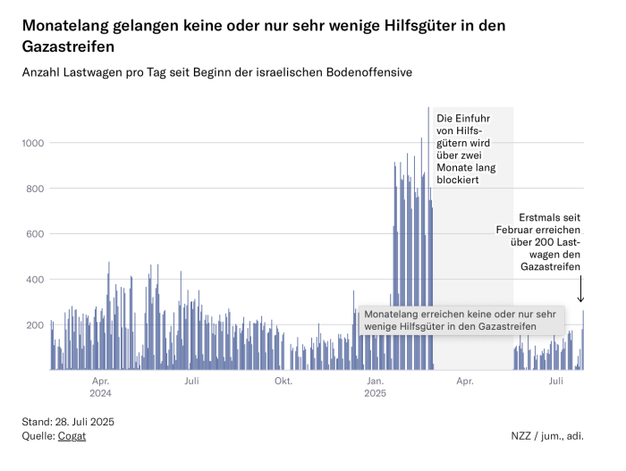 Dass sich die Versorgungslage in Gaza seit dem 18. März, als Israel einseitig die Waffenruhe brach und seither mit immer brutalerer Gewalt gegen die Hamas vorgeht, deutlich verschlechtert hat, steht ausser Diskussion. Das ‘UN-Office for the Coordination of Humanitarian Affairs (OCHA)’ behauptet: «Von den 56.000 Kindern unter 11 Jahren, die, (wenn man den Zahlen glauben darf) in Gaza City, Deir al-Balah und Khan Younis leben, leiden 5.000 an ernster Mangelernährung. Seit Anfang 2025 starben, so der UNO nahestehende nicht genannte Organisationen, 20 Kinder an den Folgen der Unterernährung, 13 davon allein im Juli. Die UNO blieb auch die Erklärung schuldig, welche Mechanismen zur Erhebung der Daten eingesetzt wurden.