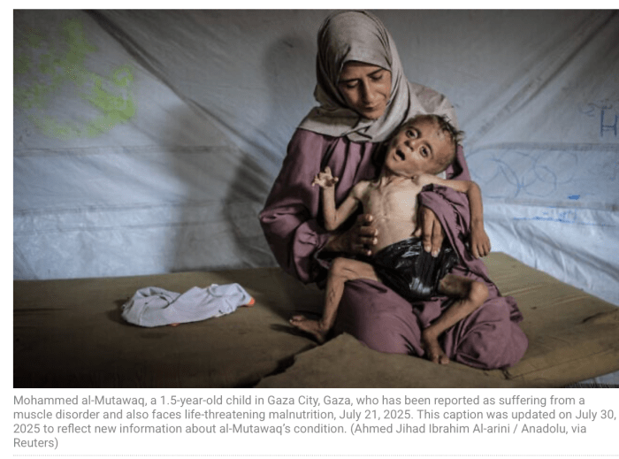 Es gibt die Bilder der grausam abgemagerten Kinder in Gaza. Kleinkinder auf dem Arm ihrer Mütter, dem Tod näher als dem Leben. Die unglaubliche Leere, die Verzweiflung in den Augen. Bilder, die heftigste Emotionen triggern, zu Recht. Wer Kinder so leiden lässt, verdient es, dass die Welt ihn an den Pranger stellt. Die NYT widmete dem Thema einen grossen Artikel. Doch dann kam die Wahrheit hinter einigen der Bilder ans Licht.