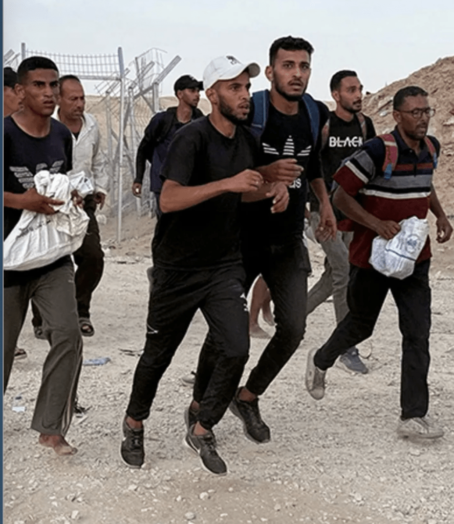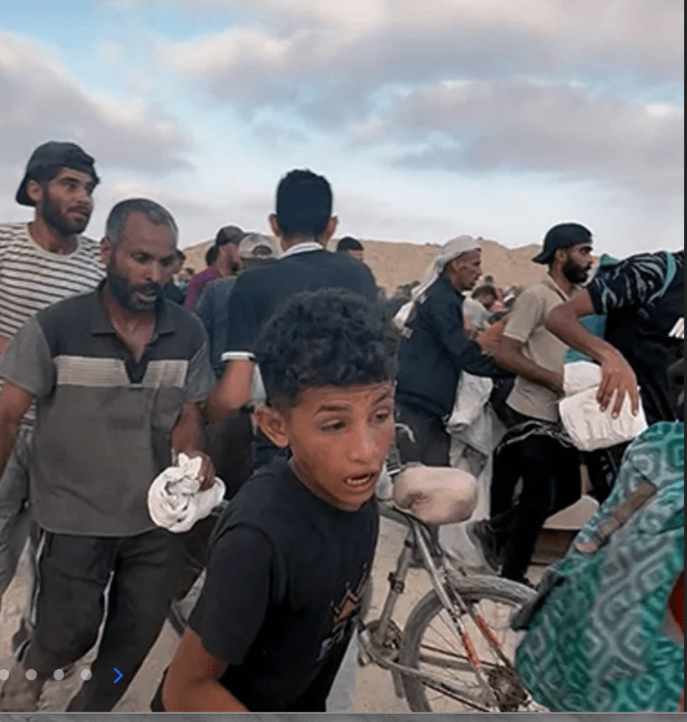 Die Wege liegen teilweise auf den israelischen ‘firing-fields’, viele Menschen nehmen das Risiko auf sich und schlafen einfach möglichst nahe der Ausgabezentren am Boden. Seit dem 26. Mai sind angeblich mehr als 1.000 Menschen erschossen worden. Wer hat geschossen? Hamas und IDF weisen sich gegenseitig die Schuld zu.