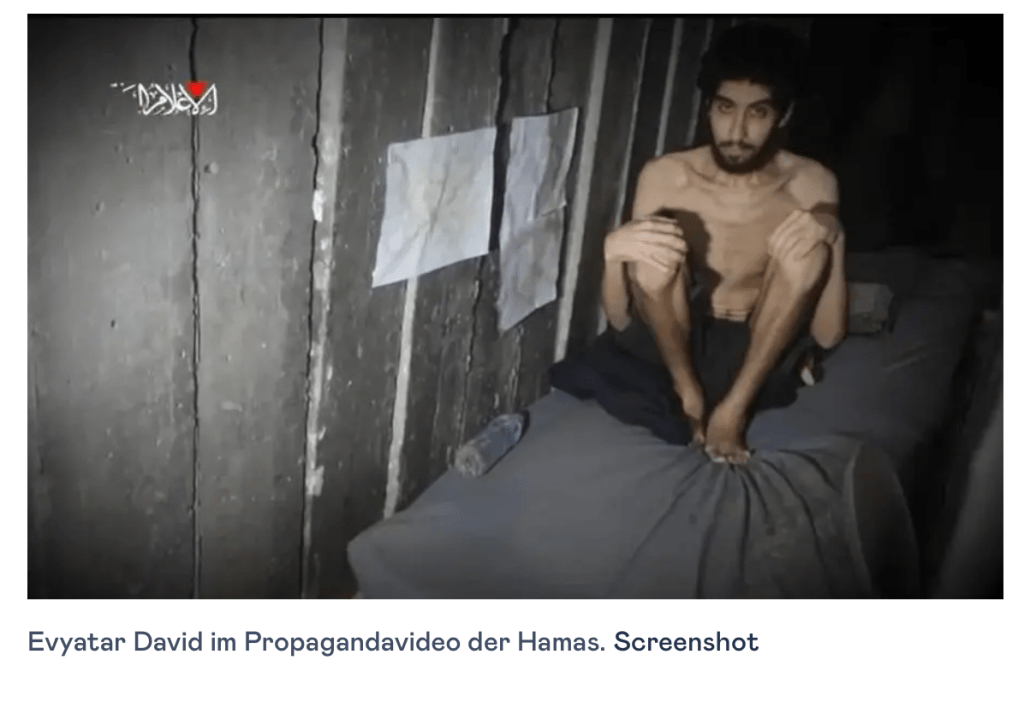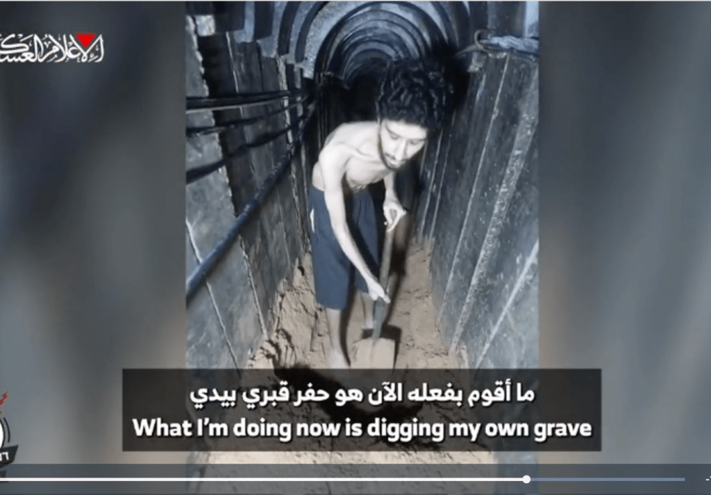 Die Hamas hat am Freitag ein weiteres Geisel-Video veröffentlicht. Bei der Geisel handelt es sich um Evyatar David, 25, der in einem Tunnel gezeigt wird, in dem er kaum völlig aufrecht stehen kann. Evyatar ist nur noch Haut und Knochen und kann kaum noch laufen. In einem zweiten Video sieht man Evyater auf einem Blatt markieren, was er seit Anfang Juli zu essen bekommen hat. Es ist zu wenig zum Leben. Am Ende des Videos sieht man, wie er gezwungen wird, sein ‘eigenes Grab’ zu schaufeln.