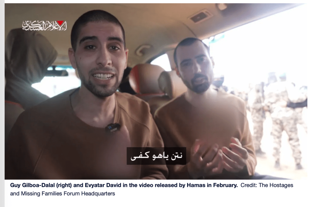 Im Februar war Evyatar von der palästinensischen Terror-Organisation Hamas gezwungen worden, gemeinsam mit Guy Gilboa-Dalal, 24, der ‘Verabschiedungszeremonie’ von freigelassenen Geiseln von einem Pkw aus zuzuschauen.