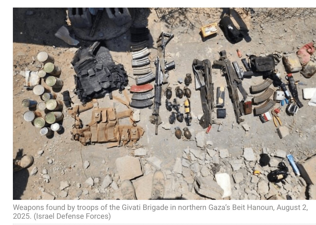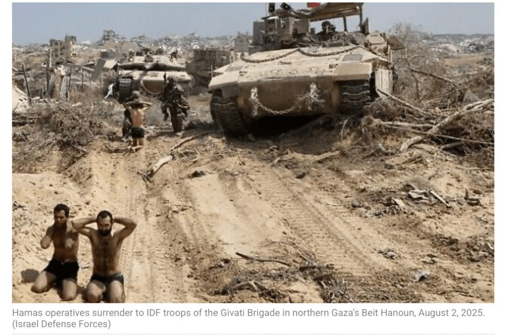 Heute Morgen haben sich drei Hamas-Terroristen der IDF ergeben und wurden zur weiteren Befragung gebracht. Die drei waren plötzlich aus einem Tunnel aufgetaucht. Sie erklärten nach ihrer Festnahme, dass sie versucht hätten, aus der Gegend zu fliehen, nachdem ein vierter Terrorist in einem Feuergefecht mit der IDF erschossen worden war. Die Festgenommenen führten die IDF zu einem Waffenlager in der Nähe des Tunnels. Bevor dieser von der IDF zerstört wurde, wurde er untersucht und kartografiert. Man fand dort nicht nur gut ausgestattete Infrastrukturen, sondern auch Lebensmittel, Wasser und andere Vorräte, die für einen längeren Aufenthalt von mehreren Personen ausreichend waren. Mit der Aufgabe dieser drei Terroristen erklärte die IDF das ‘Beit Hanoun Bataillon’ für ausgeschaltet.