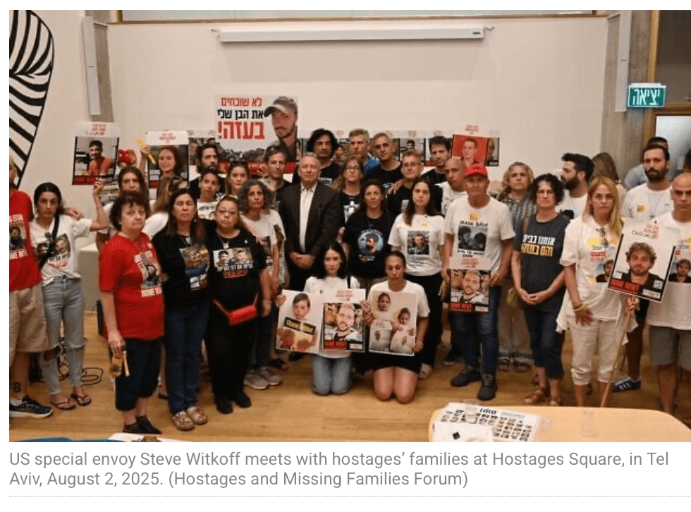 Der US-Sonderbeauftragte Steve Witkoff hat sich mit drei Stunden mehr Zeit für die Familien von Geiseln und Vermissten genommen, als es ein Regierungsmitglied jemals geschafft hat. Von Netanyahu ganz zu schweigen. Bei einem Treffen auf dem ‘Platz der Geiseln’ betonte er: «Eine Mehrheit der Israelis will die Geiseln zu Hause haben, und eine Mehrheit der Bevölkerung in Gaza will die Rückkehr der Geiseln, weil sie den Wiederaufbau des Gazastreifens will. Es gibt keinen Sieg, ohne alle nach Hause zu bringen. Sie alle sind Teil meiner Familie geworden.» Er betonte, und widersprach damit den Plänen der Regierung, dass die Gespräche das Ende des Krieges und die Freilassung aller lebenden und toten Geiseln anstreben müssen. Es darf, so Witkoff, nicht wieder ein Teilabkommen geben.