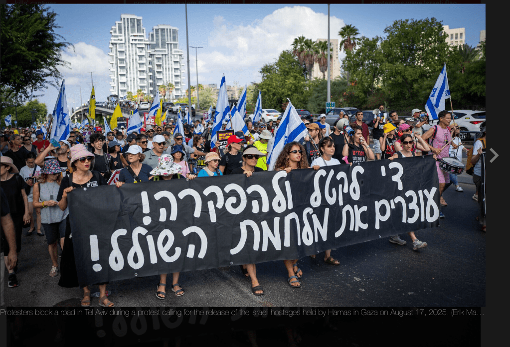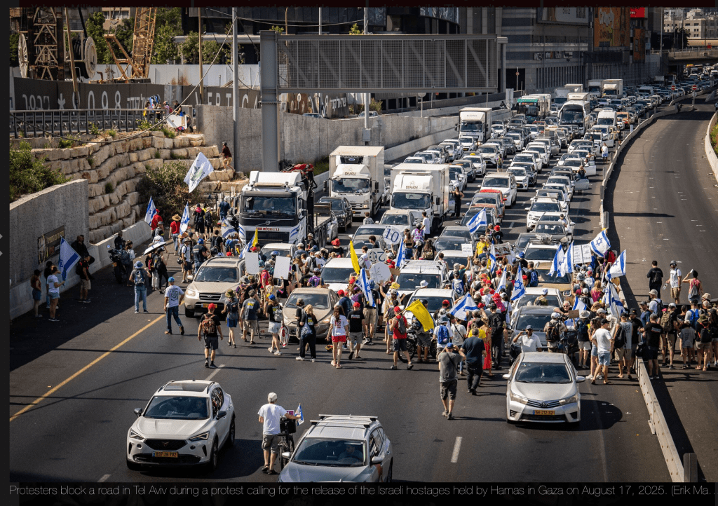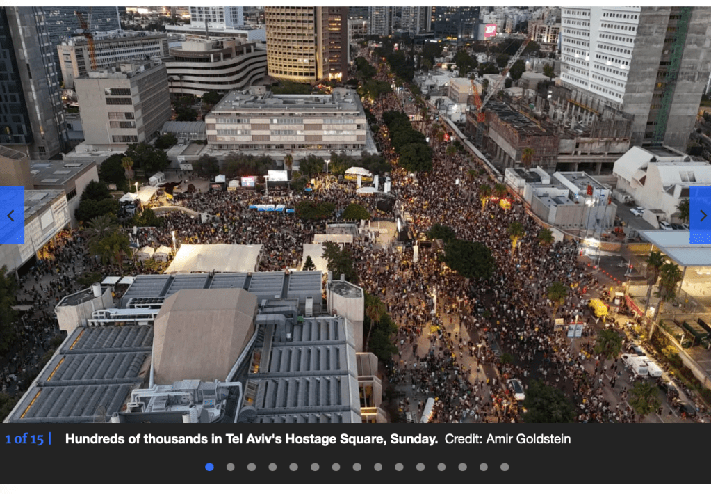 Oppositionsführer Yair Lapid erklärt bei seinem Besuch auf dem Platz der Geiseln: «Wir legen heute das Land lahm. Denn unsere Geiseln sind keine Schachfiguren, die die Regierung für den Krieg opfern darf – sie sind Bürger, die die Regierung ihren Familien zurückgeben muss. Sie werden uns nicht aufhalten, sie werden uns nicht ermüden, sie werden uns nicht erschöpfen, wir werden weiterkämpfen, bis die Geiseln nach Hause zurückkehren, es ein Abkommen gibt und der Krieg beendet ist.»