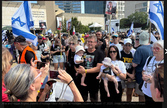 Nur wenig später trifft eine weitere Gruppe von Familienangehörigen auf dem Platz ein. Einav Zangauker, die Mutter von Matan, Anat und Haggai Angrest, die Eltern von Matan, Danny Elgarat, Bruder von Itzik und Viki Cohen, die Mutter von Nimrod. Sie machten aus ihren Herzen keine Mördergrube. «Netanyahu ist ein Faschist und Feigling», erklärte Anny Elagart. «Die israelische Regierung hört uns überhaupt nicht zu!», ergänzte Viki Cohen. Bei dieser Gruppe war auch Ayelet Goldin, die Schwester von Hadar. Seine sterblichen Überreste werden seit 2014 in Gaza festgehalten. «Ich bin den ganzen Weg vom Golan heruntergefahren. Jede Kreuzung war voller Menschen», erzählte sie gerührt. «Die Geiseln sind das Herzstück der israelischen Gesellschaft. Wir müssen sie zurückholen, um zu uns selbst und unseren Werten zurückzufinden.» Noga, eine Tante von Alon Ohel betonte: «So schwer es mir auch fällt, es ist nichts im Vergleich zu dem, was er durchmacht», sagt sie. «Wir dürfen nicht aufhören, für sie zu kämpfen. Sie zu retten bedeutet, uns selbst zu retten.»