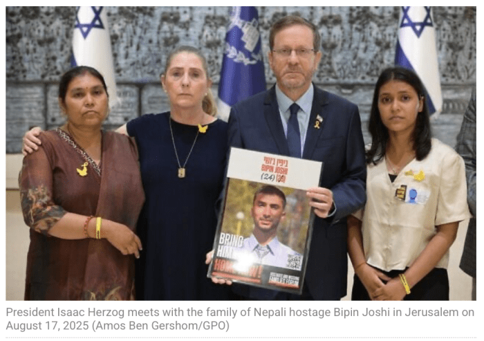 Nach seinem Besuch auf dem Platz der Geiseln, traf sich das Präsidentenpaar mit der Mutter und Schwester der nepalesischen Geisel Bipin Joshi in der Residenz. «Bipins Aufenthaltsort ist unklar, aber Israel und alle, denen unsere Geiseln am Herzen liegen, tun alles, um ihn nach Hause zu bringen. Wir schreien und rufen die internationale Gemeinschaft an: Hört auf die Stimme von Bipin», sagt Herzog zu Bipins Mutter Padma und seiner Schwester Pushpa. Der Erklärung zufolge schloss sich ihnen auch der nepalesische Botschafter in Israel, Dhan Prasad Pandit, an. Zuvor waren die Nepalesen ebenfalls auf dem Platz der Geiseln gesehen worden,
