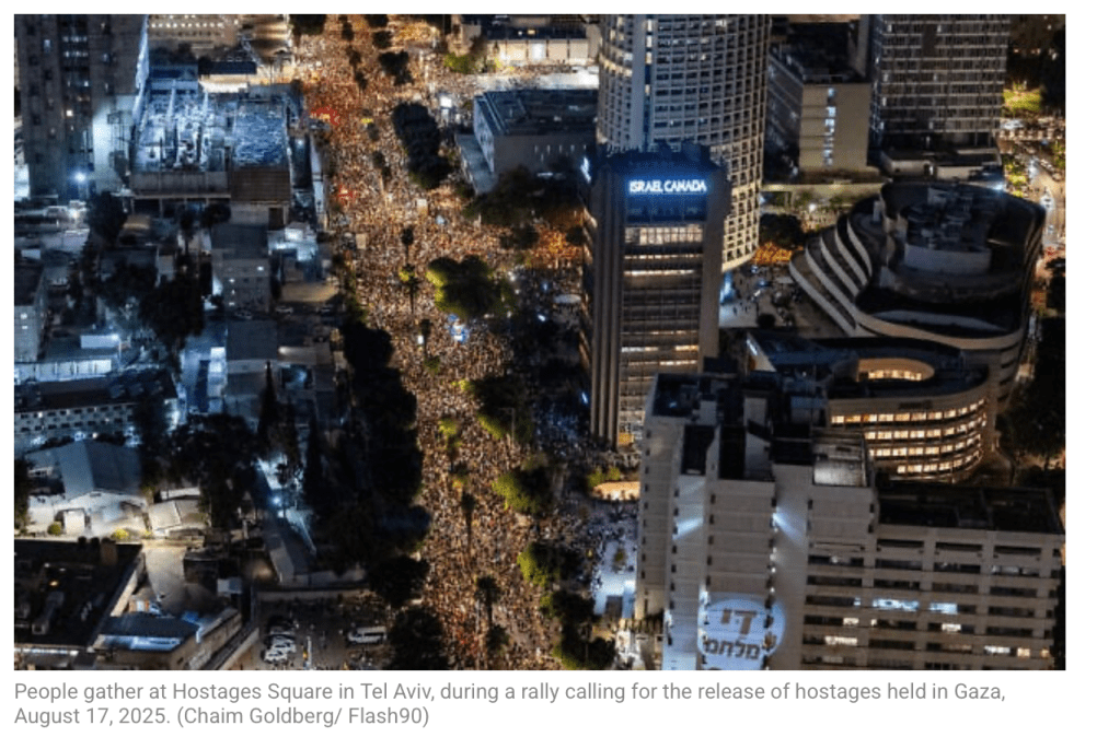 Die Organisatoren der Schlussveranstaltung korrigierten nach dem Ende noch einmal die Teilnehmerzahlen nach oben. Allein am Platz der Geiseln und in der nahen Umgebung hatten sich 500.000 Menschen versammelt, um für ein sofortiges Ende des Krieges und eine sofortige Freilassung aller Geiseln zu demonstrieren. Israelweit wurden die Zahlen mit einer Million beziffert. Das liegt deutlich niedriger, als am Nachmittag vermutet.