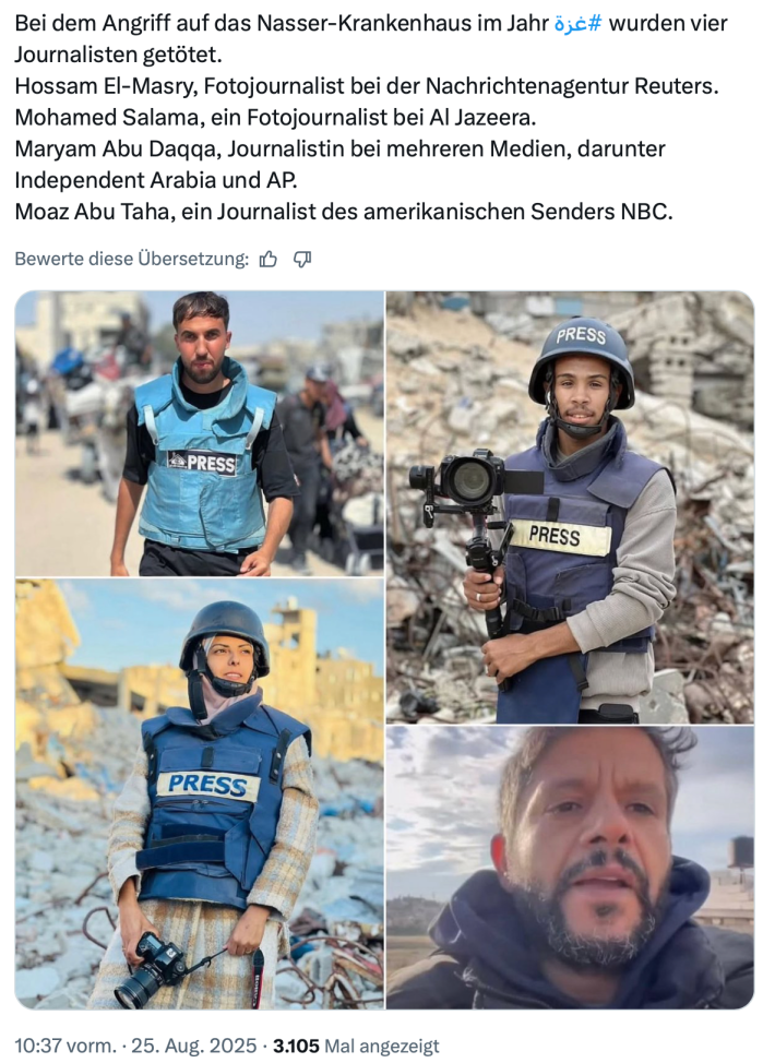 Israel hat immer wieder festgehalten, dass zahlreiche ‘Journalisten’ sich hinter diesem Schutz verstecken, in Wirklichkeit aber aktive Mitglieder der palästinensischen Terror-Organisation Hamas sind und sogar aktiv am Massaker teilgenommen und live vor Ort berichtet haben. Das Nasser Spital war in den letzten Monaten immer wieder Schauplatz von Kämpfen, bei denen die IDF führende Hamas-Mitglieder neutralisieren konnte.