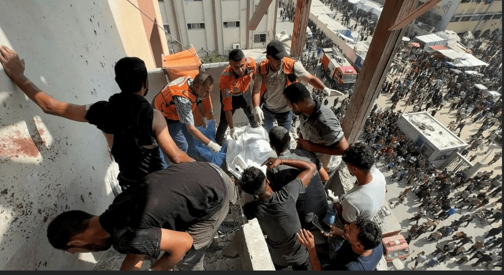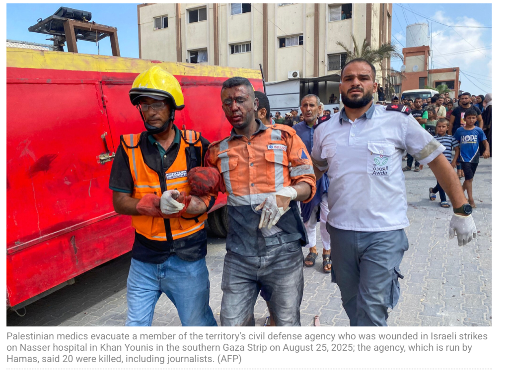 Während in Israel scheinbar alles im Modus: ‘business as usual’ zu laufen scheint, kann man in der Presse empörte Kommentare lesen. Das ‘Nasser-Krankenhaus’ in Khan Younis wurde heute von zwei Angriffen getroffen. Beide wurden gezielt auf das äussere Treppenhaus des Spitals durchgeführt. Dieser Platz wird bevorzugt von Journalisten aufgesucht, um von dort einen guten Blick auf das kriegerische Geschehen zu haben. Dieser Platz wurde heute vier Journalisten zum Verhängnis. Insgesamt wurden 20 Menschen Opfer der Angriffe. Der zweite Angriff erfolgte, nachdem sich bereits Helfer auf den Weg zu den tödlich Getroffenen gemacht hatten. Zeugen beobachteten, dass sich bei den zu Hilfe eilenden sowohl Zivilisten, als auch Journalisten befanden.