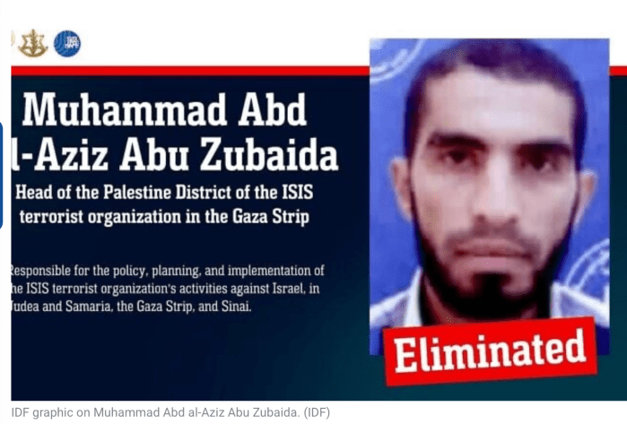 Bereits in der vergangenen Woche wurde Muhammad Abd al-Aziz Abu Zubaida, der ranghöchste Vertreter der ISIS im Gazastreifen eliminiert. Der gezielte Angriff fand in al-Bureij im Zentrum des Gazastreifens statt. Zubaida operierte sowohl in Gaza als auch in Judäa und Samaria sowie im Sinai. Zu seinen Aufgaben gehörte der Waffen- und Geldschmuggel von Samaria und Judäa nach Gaza, aber auch die Planung und Durchführung von Anschlägen gegen die IDF.