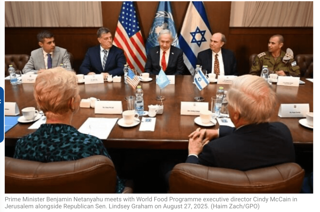 So schnell fallen verlogene Aussagen auf! Gestern liess Netanyahu in seinem Facebook account schreiben «Am Mittwoch, dem 27. August, traf sich Premierminister Netanyahu in Jerusalem mit dem US-Senator Lindsey Graham und Cindy McCain, der Exekutivdirektorin des Welternährungsprogramms (WFP). Sie diskutierten über die humanitäre Lage in Gaza und darüber, dass die Hamas die Hilfsgüter plündert. Frau McCain räumte ein, dass die gestohlenen Hilfsgüter, die an die Hamas gehen, nicht humanitär genutzt werden. Die Hamas beschlagnahmt sie und verkauft sie zu Wucherpreisen. Sie sagte, dass sie bei ihrem jüngsten Besuch in Gaza eine dramatische Verbesserung festgestellt habe: Es gab Lebensmittel, die Preise waren gesunken, und auf den Märkten gab es ein ausreichendes Angebot an Waren zu erschwinglichen Preisen.