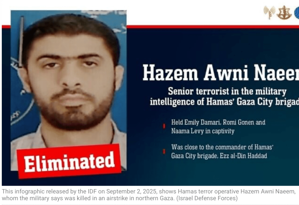 Hazem Awni Naeer, ein führendes Mitglied der Hamas, wurde bereits in der vergangenen Woche in Gaza-City eliminiert. Es gilt als erwiesen, dass Emily Damari, Romi Goren und Naama Levy sich in seiner Gewalt befanden, bevor sie während der zweiten Waffenruhe im Januar/Februar freigelassen wurden. Naeer war Anführer der Gaza-City-Brigade und Mitglied der Aufklärungseinheit. Emily Damari zeigte sich erleichtert, dass «er jetzt niemandem mehr Schaden zufügen kann. «