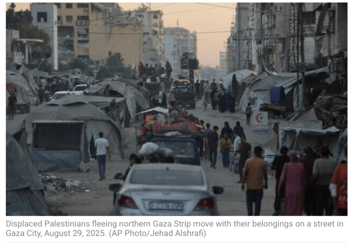Der arabisch-sprachige IDF-Sprecher Avichay Adraee hat gestern die Evakuierung aller Bürger von Gaza-City in die Mawasi Zone im Süden des Gazastreifens angeordnet. Dor würden sie alle humanitäre Unterstützung sowie medizinische Betreuung, Wasser und Lebensmittel erhalten. Gleichzeitig warnte er davor, in ein Kampfgebiet zurückzukehren, wo ihre Sicherheit nicht gegeben ist. Offenbar unternimmt die Hamas immer wieder Versuche, die Flüchtigen zum Zurückkommen zu bewegen, indem sie ihnen mitteilen, es gebe keine Evakuierungspläne und der Verbleib in Gaza sei sicher. Nach Angaben der IDF sind in den letzten 72 Stunden 70 – 80.000 Menschen in den Süden geflüchtet.