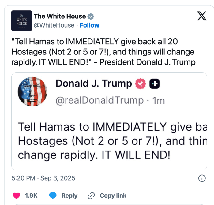 Trump postete auf seinem Social Media Account, die Hamas solle sofort alle Geiseln freilassen und die Dinge [die beidseitige Kriegsgräuel] werden sehr schnell enden.