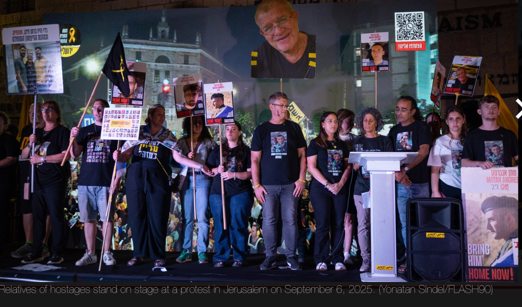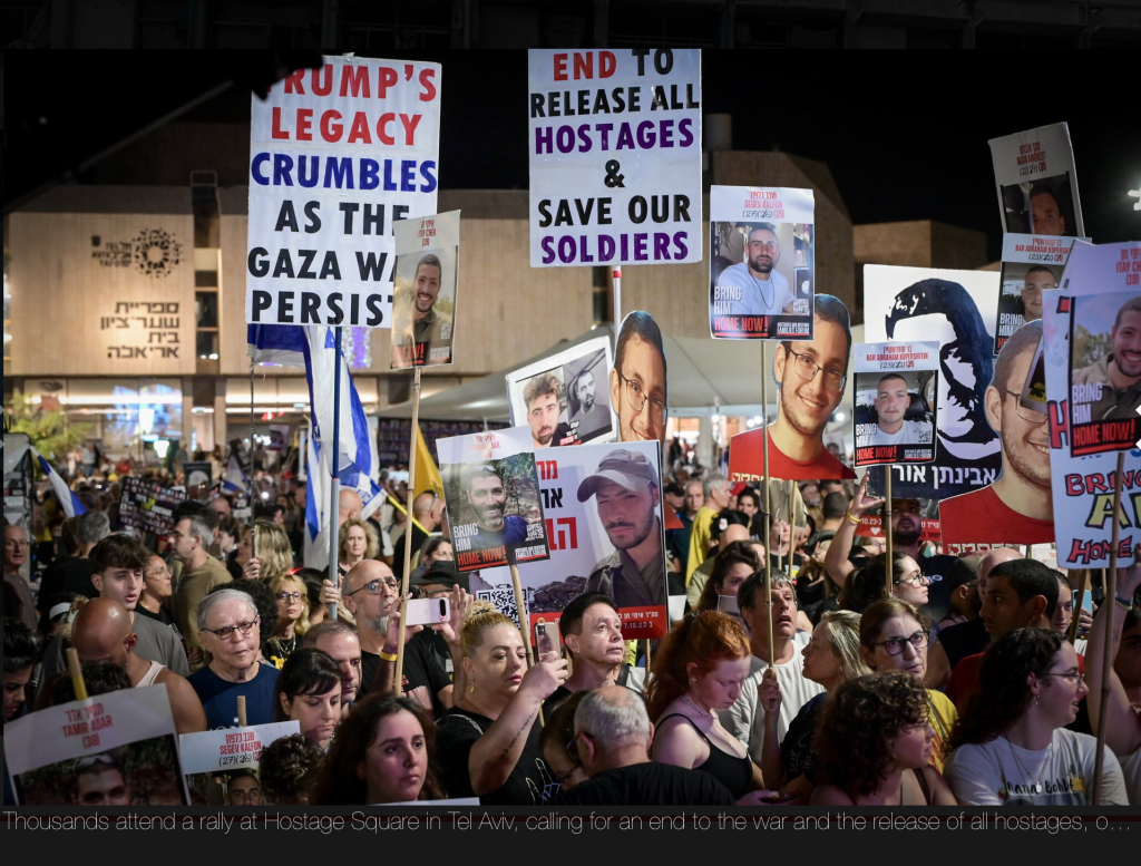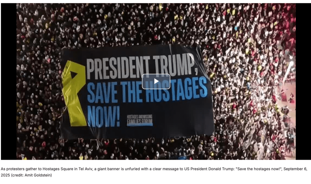 Zeitgleich fanden auch Massendemonstrationen auf dem Platz der Geiseln und seiner Umgebung statt. Inmitten der Menge wurde ein riesiges Banner entrollt: «President Trump, save the hostages now!» Eine der Sprecherinnen war die ehemalige Geisel Ilana Gritzwisky, Partnerin von Matan Zangauker: «Ich lebe immer noch in Gefangenschaft und kann Matan sehen, der ebenfalls noch in Gefangenschaft ist und langsam stirbt. Ich sehe ihn hungrig, durstig, schwach. Ich weiss nicht, ob er sich noch daran erinnert, wie meine Stimme klingt, wie ich fühle und wie ich aussehe.» Auch sie klagt Netanyahu an, den Krieg und die Geiselhaft nur aus politischen Gründen zu verlängern. «Während Matan und die Geiseln in der Dunkelheit dahinsiechen, klammert sich der PM an seinen Posten. Der Feind hat uns entführt, aber diejenigen, die uns seit 701 Tagen dort festhalten, sind Sie, die Entscheidungsträger. Ihr habt nicht alles getan. Ihr habt nicht genug getan, denn wenn ihr das getan hättet, wären sie schon hier», sagt sie und fügt hinzu: «Die Regierung hat ihre Bürger verraten.»