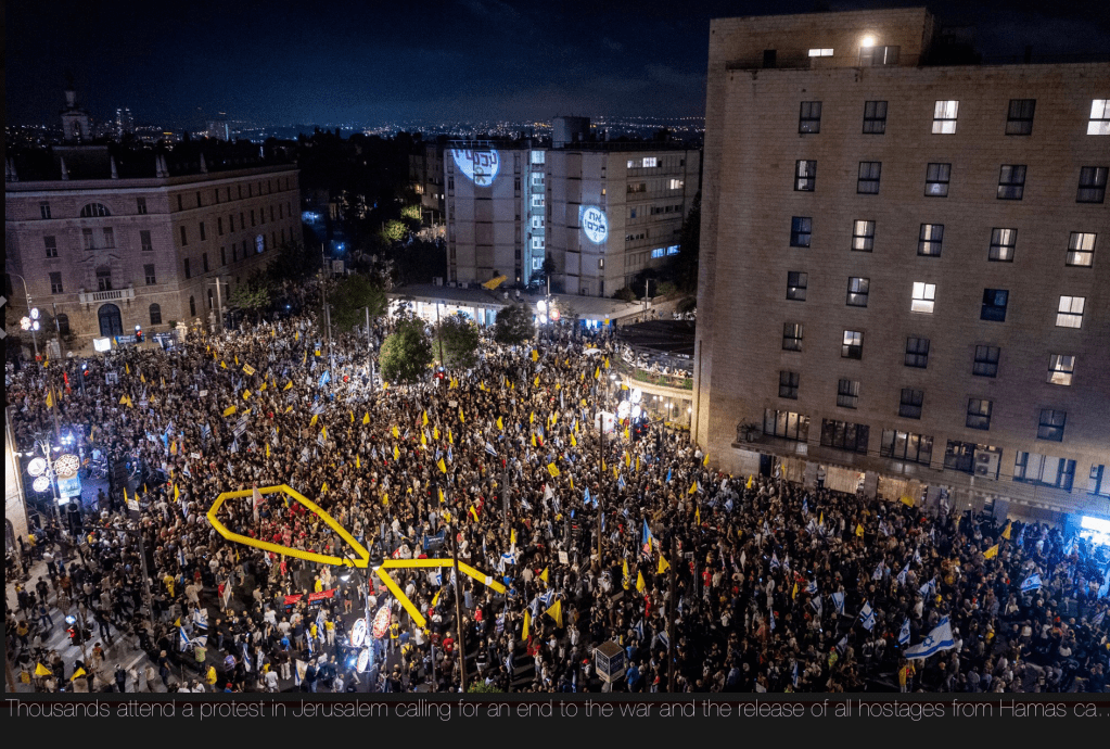 Nachdem die Hamas gestern angekündigt hatte, mit einem teilweisen Waffenstillstand und einer entsprechenden Freilassung der Geiseln einverstanden zu sein, forderten die Familien der Geiseln, dass Netanyahu eine Delegation an den Verhandlungstisch schicken soll. Allerdings beharrt die Hamas nach wie vor auf ihren Bedingungen, die von Netanyahu rigoros abgelehnt werden. Das Forum wirft Netanyahu vor, das Abkommen aus politischen Gründen abzulehnen und damit «einen endlosen Krieg fortzusetzen, dessen Zweck darin besteht, die Koalition zu erhalten. Wir fordern, dass die israelische Regierung das derzeit vorliegende Abkommen akzeptiert – auf das die Hamas bereits positiv reagiert hat – und unverzüglich Verhandlungen über ein umfassendes Abkommen aufnimmt, um alle Geiseln bis auf den letzten Mann zurückzuholen», heisst es in der Erklärung.