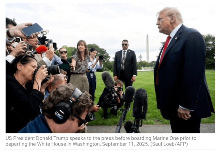 Trump ist zunehmend frustriert über das Verhalten von Netanyahu. «Jedesmal, wenn das Verhandlungsteam Fortschritte macht, greift er jemanden an und bombardiert etwas. Es kommt mir vor, als wolle er gewaltsam die Verhandlungen torpedieren.» Trump gab seiner Hoffnung Ausdruck, dass der Angriff auf Doha keinen negativen Einfluss auf die Geiseln hat, muss aber später doch zugeben, dass die Wahrscheinlichkeit besteht, dass weitere Geiseln in den letzten Tagen gestorben sind.