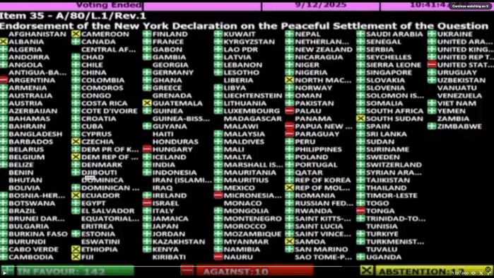 Gestern wurde in der UNO-Generalversammlung mit überwältigender Mehrheit (142) gegen 10 Ablehnungen und 12 Enthaltungen die ‘New York Declaration’ (s. gestern) angenommen. Die Abstimmung gilt als Grundlage für den Prozess, die Zwei-Staaten-Lösung zu erreichen. Die USA bezeichneten die Abstimmung als «eine weitere fehlgeleitete und unangebrachte PR-Aktion, die ernsthafte diplomatische Bemühungen zur Beendigung des Konflikts untergräbt.» Dany Danon, der Vertreter Israels bei der UNO beklagte: «Diese einseitige Erklärung wird nicht als Schritt in Richtung Frieden in Erinnerung bleiben, sondern nur als eine weitere leere Geste, die die Glaubwürdigkeit dieser Versammlung schwächt… Das ist keine Diplomatie. Das ist Theater.» Mit dem Papier wird die PA aufgefordert, die Führung eines palästinensischen Staates zu übernehmen. Die Hamas hingegen wird aufgefordert, die Kontrolle über Gaza abzugeben. Israel erklärt, dass ein solcher Schritt eine Belohnung für die Hamas darstellt. Netanyahu hatte mehrfach erklärt, dass die PA keine Kontrolle bei der Regierung des Gazastreifens erhalten darf. Gegen den Vorschlag stimmten: Argentinien, Ungarn, Mikronesien, Nauru, Palau, Papua, Neu Guinea, Paraguay und Tonga.
