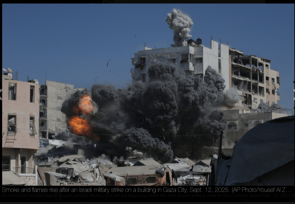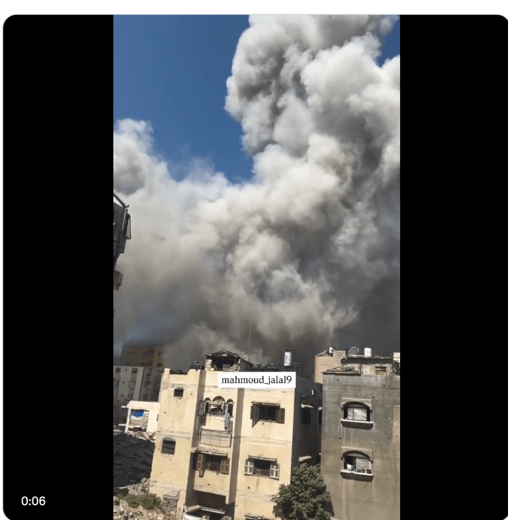 Die IAF hat erneut ein Hochhaus in Gaza-City zerstört. Auch einige Zelte der unmittelbar anschliessenden Zeltstadt wurden dabei zerstört. Zuvor hatte das Militär mit Flugblättern die sofortige Evakuierung der Region angeordnet. Lebten vor Beginn der Offensive gegen Gaza-City dort noch etwa eine Million Menschen, so haben mittlerweile 280.000 Menschen die Flucht in den Süden begonnen. Ein weiteres Ziel der IAF war heute das ‘Shati-Camp’, welches zuvor evakuiert wurde.