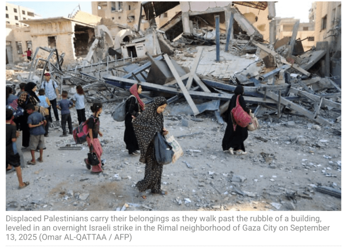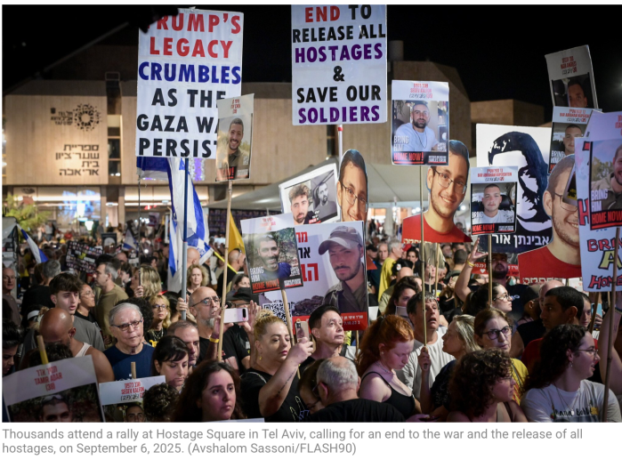 Das Forum für Familien fordert alle Israelis auf, heute Abend an den Demonstrationen teilzunehmen, die um 19 Uhr an der ‘Savidor Station’ in Tel Aviv beginnen und mit einem Slichot-Gottesdienst [Gottesdienste mit speziellen Bussgebeten, die ab heute bis Jom Kippur täglich abgehalten werden] um 23 Uhr auf dem Platz der Geiseln enden. Demonstrationen finden heute wieder in allen grösseren Städten im ganzen Land ab. «Wir erleben derzeit einen weiteren bewussten Versuch, ein Abkommen zur Freilassung von Geiseln zu sabotieren», erklärte das Forum in einer englischsprachigen Stellungnahme. «Die Besetzung des Gazastreifens und die Fortsetzung dieses endlosen, sinnlosen Krieges bringen dem israelischen Volk Zerstörung. Dies ist kein Krieg, um die Hamas zu stürzen, sondern ein Krieg, der die israelische Gesellschaft zu stürzen droht – und das werden wir nicht zulassen!» In einer weiteren Meldung auf Hebräisch heisst es: «Nach einer turbulenten Woche und dem israelischen Angriff auf dem Boden von Katar rufen die Familien der Geiseln die Nation Israel dazu auf, auf die Strasse zu gehen, sich an unsere Seite zu stellen und den Entscheidungsträgern zu sagen: Die gesamte Nation Israel steht hinter den Geiseln! Beendet den Krieg und bringt uns die 48 Geiseln zurück – jetzt!