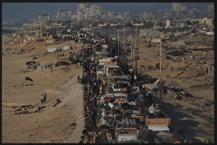 Die IDF schätzt, dass während der Nachtstunden etwa 20.000 Gazaner die Stadt verlassen haben. Somit hat etwa ein Drittel der Bevölkerung sich auf den Weg nach Süden gemacht. Die IDF hatte mehrfach Evakuierungs-Befehle für das gesamte Stadtgebiet ausgegeben. Als Ziel der Evakuierung wurden sogenannte ‘humanitäre Zonen’ im Süden des Landes genannt. Allerdings behaupten einige der Binnen-Vertriebenen auch, dass es derzeit im gesamten Gazastreifen keinen sicheren Ort gebe.