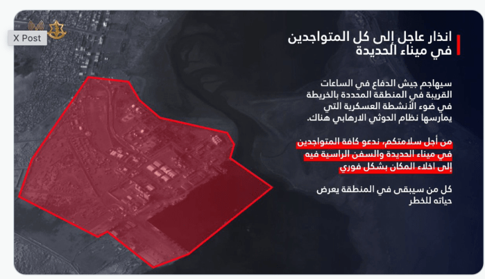 Die IDF hat eine dringende Evakuierungs-Aufforderung für den Hafen Hodeidah im Yemen veröffentlicht. Angesichts des regelmässigen Beschusses durch die Houthi-Terroristen wird Israel in den kommenden Stunden einen weiteren Angriffsflug auf den Hafen, der hauptsächlich von den Houthis genutzt wird, fliegen. Auch die im Hafen vor Anker liegenden Schiffe sollen in Sicherheit gebracht werden.