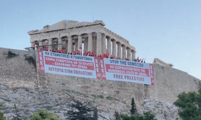 Jetzt übertreibt es das politische Griechenland aber! Die Aktivisten der Kommunistischen Partei hingen unterhalb der Akropolis auf, auf denen zu lesen stand «Stoppt den Genozid – Keine Zusammenarbeit mit dem mörderischen Staat Israel und Freiheit für Palästina!» Auf der Mauer standen zahlreiche Aktivisten, die mit roten Fahnen der Kommunistischen Partei winkten. Ein erneutes Beispiel, wie Politik, Aktivismus und Kultur, in diesem Fall zigtausend Jahre alte Kultur, die bis zum 14. Jahrhundert BCE zurückgeht, vermischt werden.