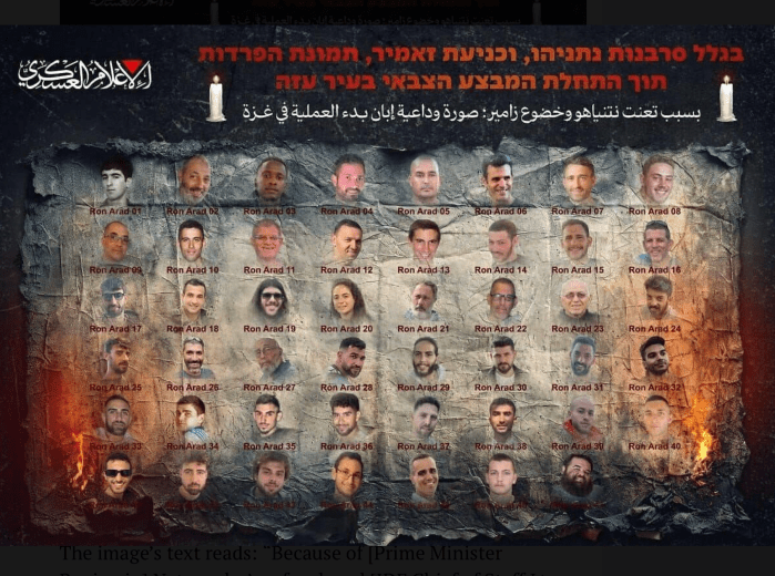 Die Hamas hat ein neues PR-Poster veröffentlicht, auf dem die noch in Gaza festgehaltenen Geiseln abgebildet sind. Doch statt ihrer eigenen Namen werden sie alle als ‘Ron Arad’ bezeichnet, der auch als erster abgebildet ist. Ron Arad stürzte mit seinem Flugzeug im ersten Libanonkrieg ab und wird seit 1988 vermisst. Übrigens sind auf dem Poster nicht 48, sondern nur 46 Geiseln abgebildet. Auf dem Post steht: «Wegen der Weigerung von PM Netanyahu und der Kapitulation von Zamir – ein Abschiedsgeschenk, bevor die Offensive beginnt.»