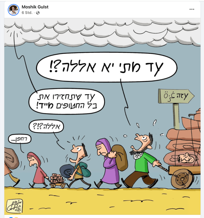 Ein ganzes Kakteen-Feld mit langen Widerhaken ist für den plumpen Versuch der ‘Thank Israeli Soldiers zu wenig! Israelische Armee-Kommandanten erlaubten es Mitgliedern der NGO ‘Thank Israeli Soldiers’ in Kampfgebiete, Sammelstellen und Militärposten zu gehen, um dort den Reservisten ein Geschenk für ihre Kinder zu überreichen. Ein Malbuch, das auf der Titelseite den Kampf David gegen Goliath darstellt. Im Hintergrund Soldaten der IDF und ein Panzer vor der Höhle Machpela. Im oberen Bildteil räumt ein grosser Bulldozer Trümmer fort, auf einem Lkw sitzen drei Soldaten. Im Hintergrund rechts ein zerstörtes Hochhaus und links eine Palmenallee mit dem Plakat I❤️Gaza das wohl die heile Welt darstellen soll. Das Malbuch titelt: ‘Gaza und wir – vom Anfang bis zu den Eisenschwertern’. Die Bilder, die die Kinder der Reservisten ausmalen sollen, zeigen Situationen vom Rückzug aus Gaza 2005 bis zu den Zerstörungen des aktuellen Krieges. Die NGO bietet auf ihrer Webseite Programme an, Teambildung für Soldaten und Spiele sowie Aktivitäten für die Familien. «Seit Simchat Torah vor zwei Jahren (7. Oktober 2023) haben Sie eine unglaubliche, wenn auch nicht einfache Zeit durchlebt», heisst es in der Broschüre, die den Familien der Reservisten der israelischen Streitkräfte gewidmet ist. «Die Broschüre, die wir für Sie vorbereitet haben, erzählt die Geschichte und das Erbe des Gazastreifens. Durch sie werden Sie verstehen, dass auch Sie ein Glied in der Kette der Generationen sind.» Kinder werden im Malbuch auch aufgefordert, die ‘richtige Lösung’ für die Zukunft Gazas zu diskutieren. Die Reservisten zeigen sich über diesen plumpen Indoktrinations-Versuch empört: «Wenn die IDF die Politik aus der Armee heraushalten will, sollte sie auch verhindern, dass die extreme Rechte die Soldaten erreicht», sagte ein Reservist. «Die Bataillons- und Brigadekommandeure haben Angst vor den Rabbinern und den rechtsextremen Extremisten, die hierherkommen. Gibt es jemanden, der daran zweifelt, was passieren würde, wenn Peace Now oder Breaking the Silence [extrem linke Aktivisten] in den Gazastreifen kämen, um Broschüren an die Soldaten zu verteilen?», fragte er sich.