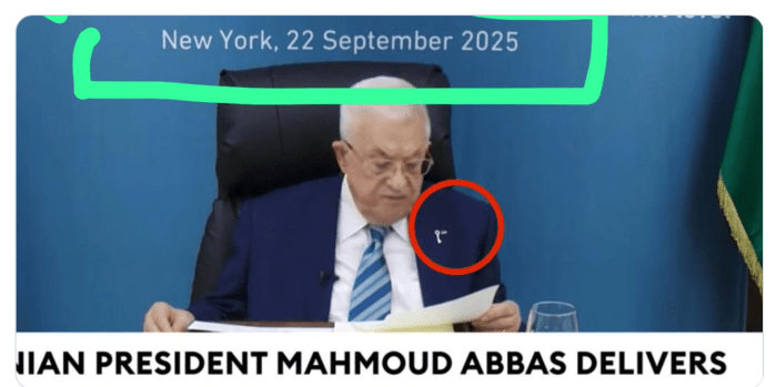 PA-Präsident Mahmoud Abbas setzte bei seiner Rede vor den UNO ein nonverbales Zeichen über seine Absichten. Wo andere am linken Revers die Flagge ihres Landes oder im Fall von Israel die gelbe Schlaufe tragen, trägt er das Schlüsselsymbol. Dieses Symbol besagt, dass der Träger beabsichtigt, in sein Haus zurückzukehren, welches er bei der ‘Vertreibung’ aufgeben musste. Eindeutiger kann man kein Statement abgeben.