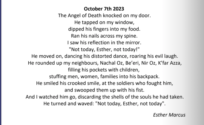 Gestern bei der Übertragung des Yom Kippur Gottesdienstes aus der ‘West London Synagogue’ wurde dieses Gedicht einer Überlebenden des Massakers vom 7. Oktober vorgetragen. Am kommenden Dienstag jährt sich der Tag zum zweiten Mal. Hier das Gedicht statt einem Abschnitt aus den ‘Sprüchen der Väter’.