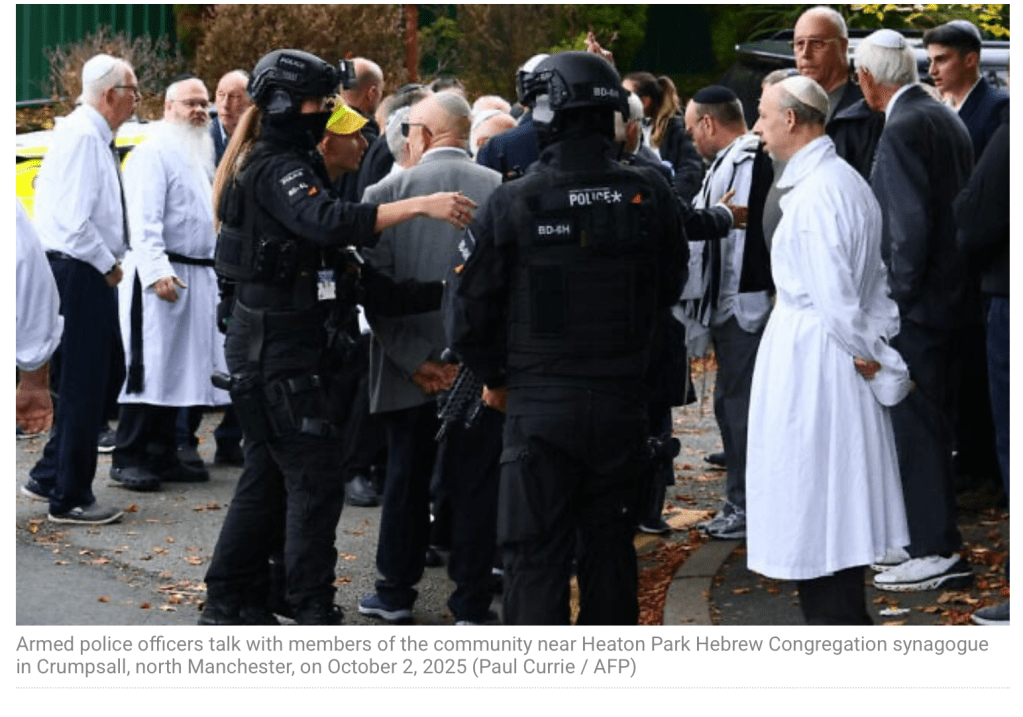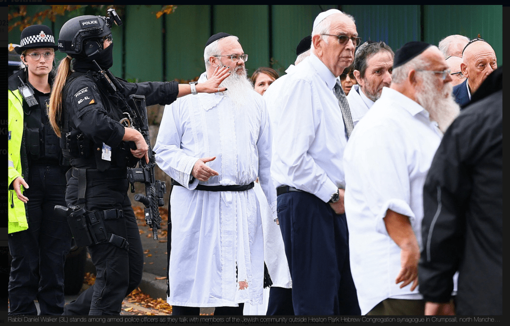 Während des Yom Kippur-Gottesdienstes in der ‘Heaton Park Hebrew Congregation’ in Manchester kam es zu einem tödlichen Terror-Angriff. Ein angeblich amtsbekannter Mann fuhr zunächst sein Auto in eine Gruppe von Menschen, die vor der Synagoge standen. Bereits unmittelbar nach dem Aussteigen begann er, auf die Menschen einzustechen. Es gelang den Besuchern des Gottesdienstes, den Terroristen am Eindringen in die Synagoge zu hindern. Vor dem Beginn des Gottesdienstes wurden Fenster und Türen sorgfältig verschlossen. Der Tod des Terroristen wurde erst nach einigen Stunden bekannt gegeben, weil der Verdacht bestand, dass er eine Sprengstoffweste trug. Zur Sicherheit wurde ein Bomben-Entschärfungs-Roboter eingesetzt. Der Verdacht stellte sich aber als hinfällig heraus. Leider sind zwei jüdische Opfer und vier Verletzte zu beklagen. Drei weitere Verdächtige wurden festgenommen. Am späten Donnerstagabend wurde der Name des Terroristen bekannt gegeben: Jihad Al-Shamie, 35, ein britischer Bürger mit syrischen Wurzeln. Bei den beiden Opfern handelt es sich um Adrian Daulby, 53, und Melvin Cravitz, 65, s’’l. Eines der beiden Opfer wurde aller Wahrscheinlichkeit nach irrtümlich von der Polizei erschossen.