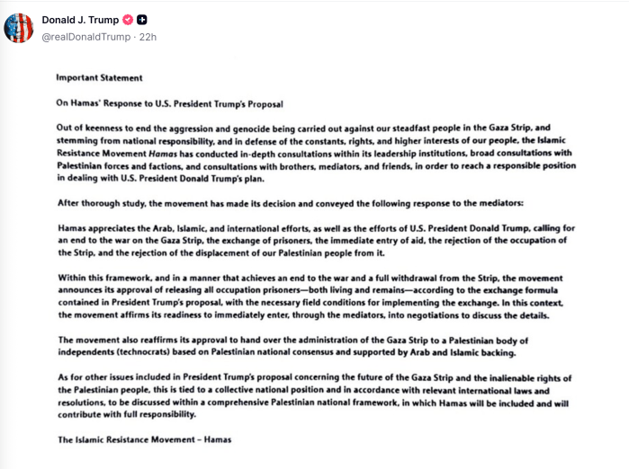 Hier die von Trump veröffentlichte Antwort der Hamas auf den von ihm vorgelegten Plan: