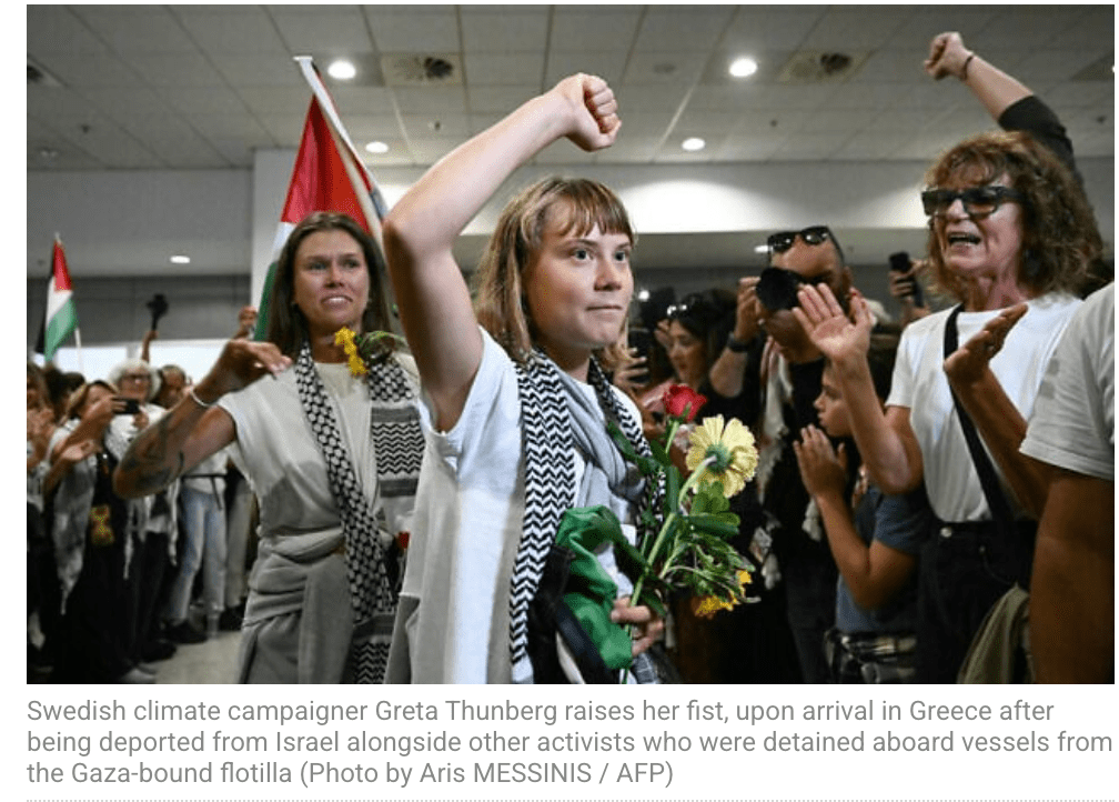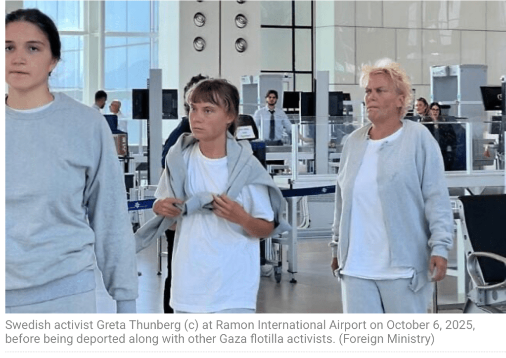 170 weitere Aktivisten der Gaza-Flotilla, einheitlich in grau-weisse Gefängnisbekleidung gehüllt, verliessen heute über den Flughafen Ramon Israel in Richtung Griechenland und Slowakei. Die Aktivisten stammen aus: Griechenland, Italien, Frankreich, Irland, Schweden, Polen, Deutschland, Dänemark, der Slowakei, der Schweiz, Norwegen, GB, Serbien und den USA. Israel betont, dass «alle Rechte der Aktivisten in dieser PR-Show während der gesamten Zeit eingehalten wurden und auch weiterhin werden. Die Lügen, die sie verbreiten, sind nichts anderes als Teil ihrer im Vorhinein geplanten Kampagne um ‘fake news’ zu verbreiten. Die einzige Gewalttat, die stattfand, war, dass eine spanische Aktivistin einen medizinischen Mitarbeiter im Ketzioit Gefängnis biss.»