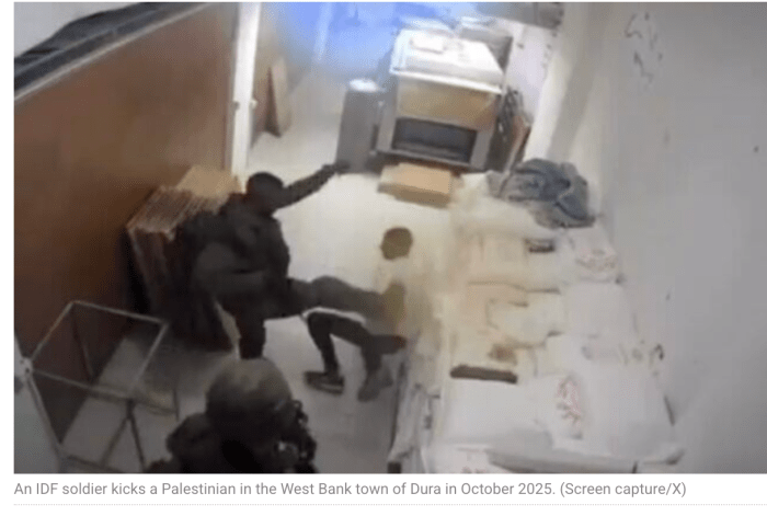 Eine Überwachungskamera zeichnete auf, wie ein Reservist mehrfach auf einen am Boden knienden Palästinenser eintrat. Ein weiterer Soldat stand tatenlos daneben. Beim Opfer dieses brutalen Angriffs handelte es sich um einen Mitarbeiter einer Bäckerei. Die Soldaten näherten sich ihm und befahlen ihm, sich auf den Boden zu setzen. Einer der Soldaten zeigte ihm etwas auf dem Handy, bevor er begann, auf ihn einzutreten. Beide Soldaten wurden sofort vom Dienst entlassen.
