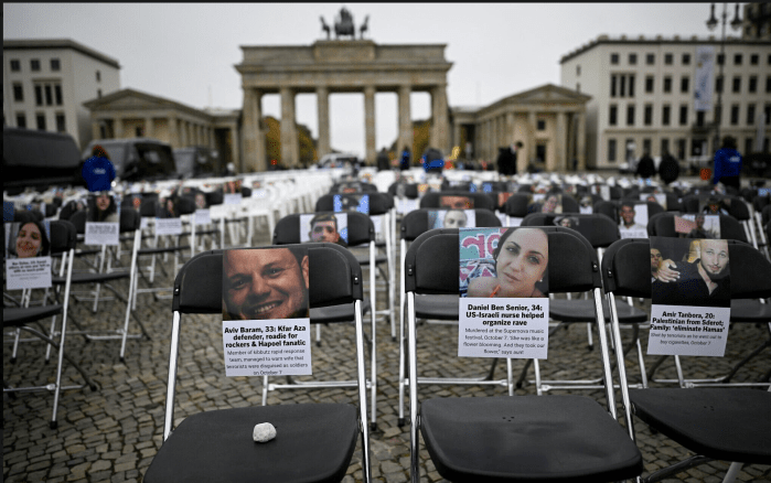 Vor dem Brandenburger Tor in Berlin wurden mehr als 1.000 Stühle mit den Bildern der Opfer vom Massaker des 7. Oktobers aufgestellt, um des zweiten Jahrestages zu gedenken. Die Aktion wurde von der ‘Jüdischen Studenten Union Deutschland’ organisiert und durchgeführt.
