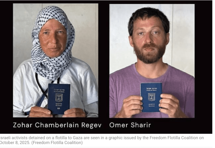 An Bord der zweiten Flotilla, die Israel ohne grosses mediales Aufsehen gestern stoppte, befanden sich auch mindestens zwei israelischen Bürger. Sie erhielten, anders als die Aktivisten anderer Staaten, keine Unterstützung durch offizielle Stellen. Sie wurden nach der Übernahme der Flotilla durch die Marine sofort in Untersuchungshaft genommen und werden in den kommenden Tagen angeklagt werden.