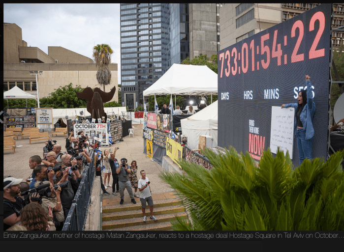 Einav Zangauker vor der grossen Uhr am ‚Platz der Geiseln‘