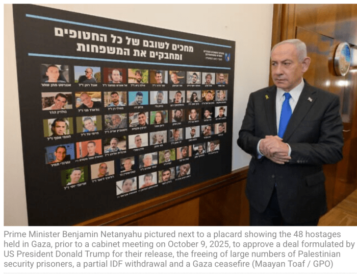 Israel hat bisher den Tod von 26 der 48 Geiseln offiziell bestätigt. Derzeit scheint man sich darauf geeinigt zu haben, dass die Freilassung der etwa 2.000 palästinensischen Gefangenen dann beginnt, wenn alle Geiseln, soweit möglich, freigelassen wurden. Und dass die Hamas bestätigt hat, keine weiteren Leichen als Druckmittel zurückzuhalten.