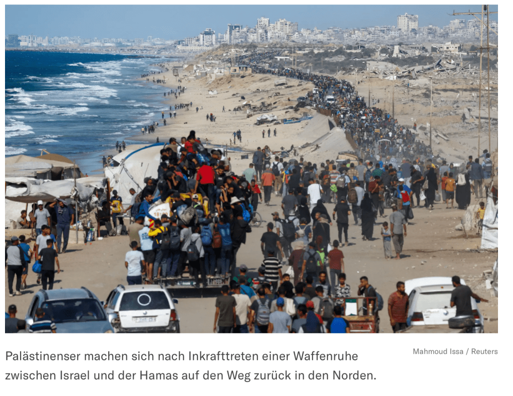 Michael Milshtein, ehemaliger Leiter der Palästina-Abteilung des israelischen Militärgeheimdienstes erklärt in der NZZ von gestern, warum die Hamas auf einmal bereit ist, die Geiseln freizulassen und warum Netanyahu seine Ziele nicht erreichen konnte. Beim Lesen des Artikels fällt vor allem auf: «Es gab einen grossen Game-Changer: Sein Name ist Donald Trump. Wenn man den Trump-Plan mit jenem von Joe Biden, dem Witkoff-Plan oder der Initiative der arabischen Staaten vergleicht, fällt eines auf: Inhaltlich gibt es keine grossen Unterschiede zwischen all diesen Vorlagen. Auch die Standpunkte Benjamin Netanyahus und der Hamas haben sich nicht signifikant verändert. Aber jetzt war Donald Trump sehr daran interessiert, ein Abkommen abzuschliessen. Wir müssen ehrlich sagen, was das bedeutet: Er hat Netanyahu dazu gezwungen, ein anderes Abkommen zu unterzeichnen als jenes, das Trump und Netanyahu gemeinsam in Washington präsentiert hatten.» Ein unbedingt lesenswerter Artikel, der die Augen öffnet und nachdenklich macht.