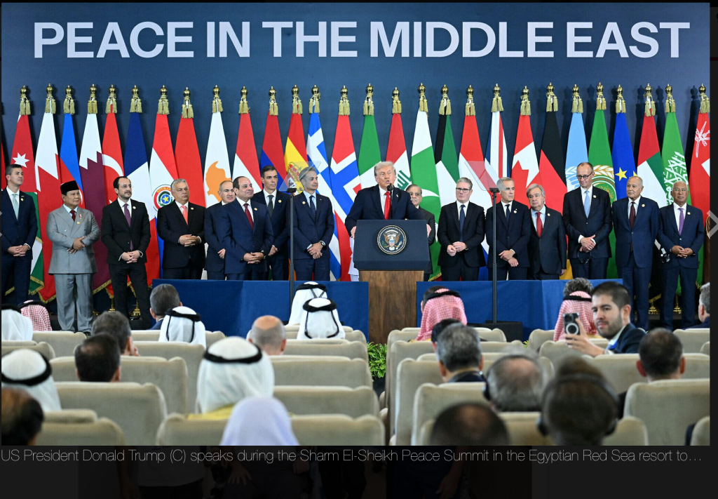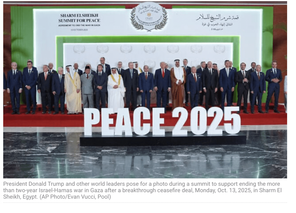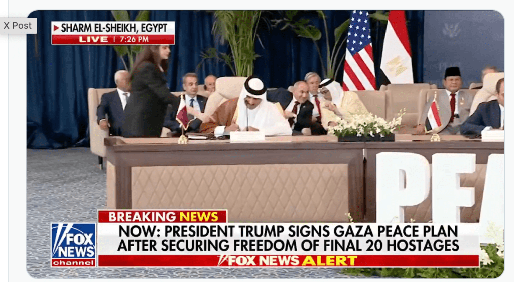 Die Staatschefs der Türkei, Katars, Ägyptens und der USA unterzeichneten gestern Abend in Sharm el-Sheikh das Dokument, das den Waffenstillstand in Gaza festigen soll, sollte es jemals so weit kommen. Es hält mit Regeln und Vorschriften fest, wie dieser Waffenstillstand überprüft werden wird. «Dreitausend Jahre hat es bis hierher gebraucht, es ist unglaublich», raisonierte Trump «aber es wird halten, es wird halten.» Auf welchen Zeitraum sich Trump bezog, blieb offen. An die hinter ihm sitzenden Staatschefs gewandt erklärte er: «Sie wollten Gaza in Ordnung bringen. Sie wollten die ganze Sache in Ordnung bringen. Es war an einem Punkt angelangt, an dem es einfach verrückt war. Sie haben immer davon gesprochen, dass der Dritte Weltkrieg im Nahen Osten beginnen würde, aber das wird nicht [mehr] passieren», fügte er hinzu. Ohne den genauen Inhalt des Dokuments bekannt zu geben, erhielt es vom Weissen Haus den Titel: ‘Gaza-Friedensplan für den Frieden im Nahen Osten’. Vor der feierlichen Unterzeichnung defilierten die etwa 35 Teilnehmer an Trump vorbei, Shake-Hands, einige wenige persönliche Worte, ein Erinnerungsfoto und abtreten. Trump hielt vor seinem Abflug aus Sharm el-Sheikh fest, dass sein Plan nichts mit der Zwei-Staaten-Lösung zu tun hat. Der ägyptische Präsident el-Sissi hatte die Hoffnung nach einem Zusammenhang Ausdruck verliehen. Dazu Trump: «Wir sprechen hier über einen ganz anderen Plan. Ich spreche über etwas ganz anderes. Wir sprechen über den Wiederaufbau von Gaza.» Bei dieser Aussagen werden einige Teilnehmer trocken durchgeschluckt haben……