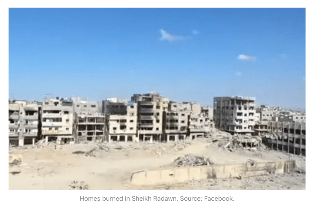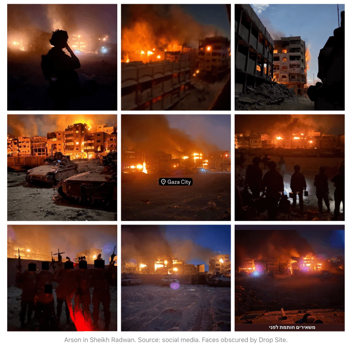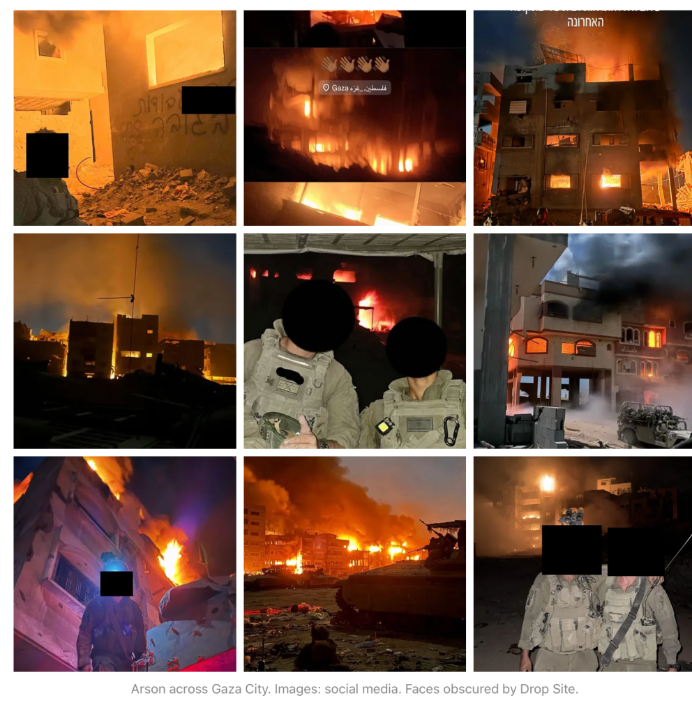 Angeblich sollen Soldaten der IDF in den letzten Stunden vor Inkrafttreten der Waffenruhe Häuser, eine Kläranlage und Lebensmittelvorräte in Gaza in Brand gesetzt haben. Allein die Kosten für die völlig zerstörte Kläranlage ‘Sheikh Ajilin’, die zur Gänze von Deutschland finanziert wurde, werden mit US$ 19 Millionen beziffert. ‘Drop Site News’ berichtet am 12. Oktober in einem reich bebilderten israel-kritischen Artikel über das angebliche destruktive Vorgehen der IDF, die ‘seit zwei Jahren ihr Markenzeichen sind’. Yuval Abraham sammelte Zeugenaussagen von Soldaten, die eine Vielzahl von Brandstiftungsmethoden beschrieben. «Jedes arabische Haus, das wir betraten, hatte Olivenöl […] Wir gossen das Öl auf die Sofas, auf alles Brennbare in der Wohnung und zündeten es dann an oder warfen eine Rauchgranate hinein. Das war gängige Praxis», beschrieb einer von ihnen. Yuval Abraham ist Journalist und Dokumentarfilmer, der vor allem durch den Film ‘No other land’ bekannt wurde. Der angeblich interviewte Soldat, dessen Namen selbstverständlich im Dunkeln bleibt, hatte weiterhin behauptet, das Ziel sei es gewesen, Gaza zu 100 % unbewohnbar zu machen. Das angeblich Zitat von Gila Gamliel, Likud, findet sich nicht im Netz, wohl aber eine ähnliche Aussage vom Kanal 12: «Gaza wird keine Quelle für lebensfähigen Wohnraum sein. Der Gazastreifen hat schon heute kein Potenzial für Lebensfähigkeit.» ‘Drop Site News’ behauptet, an den Verwüstungen und Zerstörungen, die in mehreren Stadtvierteln von Gaza City stattfanden, wären Mitglieder der Elite-Einheiten Golani, Givati, Nahal und der ultraorthodoxen Hasmonäer-Brigade beteiligt gewesen. Monther Shoblag, Direktor der palästinensischen NGO ‘Coastal Municipalities Water Utility’ wird angeblich zitiert, dass die Brandstiftung der Kläranlage einem klaren Muster der israelischen Angriffe auf das Wasser im Gazastreifen entspricht. Die zerstörte Anlage war die letzte noch funktionierende ihrer Art in Gaza. Die auf der Webseite geposteten Bilder zeigen angeblich von den Soldaten auf ihren Social-Medien-Accounts gepostete Bilder.