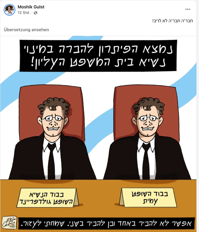 Kommunikationsminister Shlomo Karhi behauptet, dass der Präsident des OGH, Isaac Amit, sich selbst auf diesen Posten gesetzt hat. Karhi schreibt, nur Stunden, nachdem Knesset-Sprecher Ohana dem Präsidenten den Titel verweigerte: «Derjenige, der sich unter Verletzung des Gesetzes mit Gewalt zum Präsidenten des Obersten Gerichtshofs ernannt hat, ist nicht der Präsident. Amit ist nicht der Präsident. Er handelt an seiner Stelle, er träumt davon, Präsident zu sein, vielleicht ist er kurz davor – aber er wurde nicht legal ernannt und ist daher einfach nicht der Präsident.» Der völlig ordnungsgemässen und deshalb auch legalen Wahl von Präsident Isaac Amit war ein trotziges Verhalten von JM Yariv Levin vorausgegangen. Der hatte sich 16 (sic!) Monate geweigert, das Richter-Wahl-Komitee einzuberufen, weil von vornherein klar war, dass er dort seinen Kandidaten, den ultra-rechts-konservativen Richter a.D. Yosef Elron nicht durchbringen würde. Das Komitee wurde schlussendlich ohne sein Zutun vom OGH einberufen und die Wahl wurde in seiner Abwesenheit mehrheitlich durchgeführt. Einige Likudniks, inkl. Amir Ohana, weigern sich seither kindisch, Präsident Isaac Amit anzuerkennen. Die NGO ‘Movement for Quality Government’ hat verlangt, dass JM Yariv Levin acht Monaten nach der Wahl von Isaac Amit zum Präsidenten des OGH diese endlich, wenn auch deutlich verspätet in der offiziellen Staats-Gazette veröffentlichen muss. Amir war am 26. Januar gewählt und am 13. Februar vereidigt worden. Das Büro des JM lehnte eine Stellungnahme ab. Ein erneutes Zeichen, wie marod die aktuelle Regierung ist. Pluralistisches Denken innerhalb des demokratischen Rahmens wird einfach abgelehnt.
