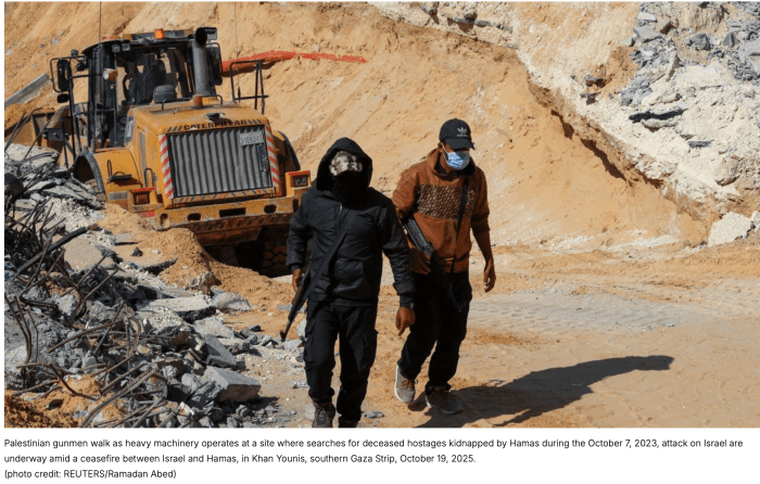 Das IKRK wird eine Delegation nach Gaza schicken, um innerhalb der gelben Linie nach toten Geiseln zu suchen. Die Hamas betonte mehrfach, nicht in der Lage zu sein, die möglichen Fundstellen der 13 noch in Gaza vermissten toten Geiseln zu finden. Am heutigen Vormittag wird ein gemeinsamer Suchtrupp zwischen ‘Schatteneinheiten’ der Hamas und IKRK gezielt nach einer toten Geisel in Mawasi, westlich von Rafah suchen. Als ‘Schatteneinheiten’ werden jene Terroristen bezeichnet, die auf die Geiseln aufgepasst haben. Auch Ägypten hat Teams nach Gaza geschickt, um bei der Suche behilflich zu sein. Israel hat zugestimmt, dass die Suche auch westlich der Gelben Linie im von der IDF gehaltenen Gebiet fortgesetzt wird.